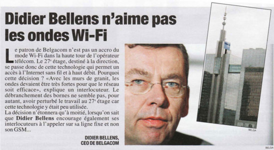 Voir également : VIDEO : "Téléphone portable : vers une directive européenne contre les ondes ?" + Le Patron de Belgacom (Belgique) coupe le Wi-fi à son étage et limite son usage du téléphone portable ! - BFM-TV - 05/12/2012 (avec mention du journaliste sur le débranchement du Wi-fi par Didier Bellens).