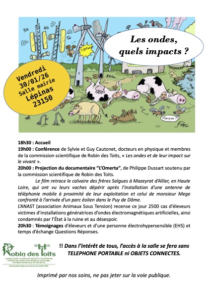 Conférences, manif, pétitions | Elevages | 16/01/2026Conférence : "Les ondes et leur impact sur le vivant" . Le 30 janvier 2026 à Lépinas (23).