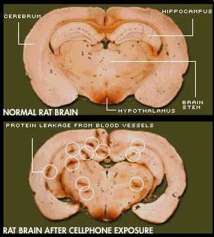Inspirés par ce travail, notre groupe a, depuis 1988 étudié les effets de différentes intensités et modulations de fréquences radio à 915 MHz sur un modèle de rat, où l'exposition à lieu dans une cellule à ligne transverse de transmission électromagnétique (TEM-cell) pendant différentes périodes de temps. Grâce à une série de plus de 1600 animaux, nous avons prouvé que les énergies non thermiques à la fois de fréquences radio, modulées en impulsions et continues, y inclus celles de téléphones mobiles réels (GSM), ont le pouvoir d'ouvrir significativement la barrière sang-cerveau à la propre albumine des animaux (mais non au fibrinogène), pour la faire pénétrer dans le cerveau et permettre à celle-ci de s'accumuler dans les neurones et dans les cellules gliales entourant les capillaires (Malmgren, 1998; Persson et al., 1997, Persson and Salford, 1996; Salford et al., 1992, 1993, 1994, 1997b, 2001) (Fig. 1). Ces résultats ont été reproduits récemment dans un autre laboratoire (Töre et al. 2001). Des résultats semblables ont également été trouvés par d'autres (Fritze et al., 1997).