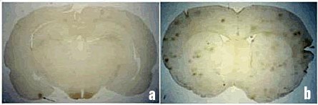 b) Parties centrales du cerveau d'un rat exposé aux fréquences radio, coloré pour l'albumine. Les multiples foyers brunâtres représentent les fuites de plusieurs vaisseaux sanguins.