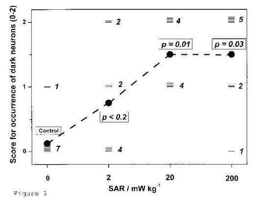 L'apparition de neurones sombres sous différentes intensités d'exposition est présentés sur la figure 3. Celle-ci montre une relation positive significative entre l'intensité des champs électromagnétiques (SAR = Taux d'absorption spécifique) et le nombre de neurones sombres.