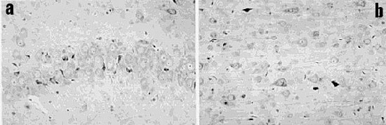 Les neurones sombres dispersés et groupés révélés par la coloration du violet de crésyle , qui étaient souvent rétrécis et colorés en foncé, se fondaient dans un aspect homogène avec perte des structures internes des cellules. Quelques uns de ces neurones sombres étaient aussi positifs à l'albumine ou montraient des microvacuoles indiquant un processus pathologique actif. Il n'y avait pas d'hémorragies, ni de réactions gliales, astrocytiques ou microgliales discernables, adjacentes aux neurones modifiés. Des neurones modifiés ont été observés à tous les endroits, mais spécialement dans le cortex, dans l'hippocampe et dans les ganglions basaux. Ils sont mélangés parmi des neurones normaux (fig. 2). Le pourcentage de neurones anormaux a été grossièrement évalué au taux d'environ 2 %, mais il est plus apparent dans quelques zones restreintes de la figure.